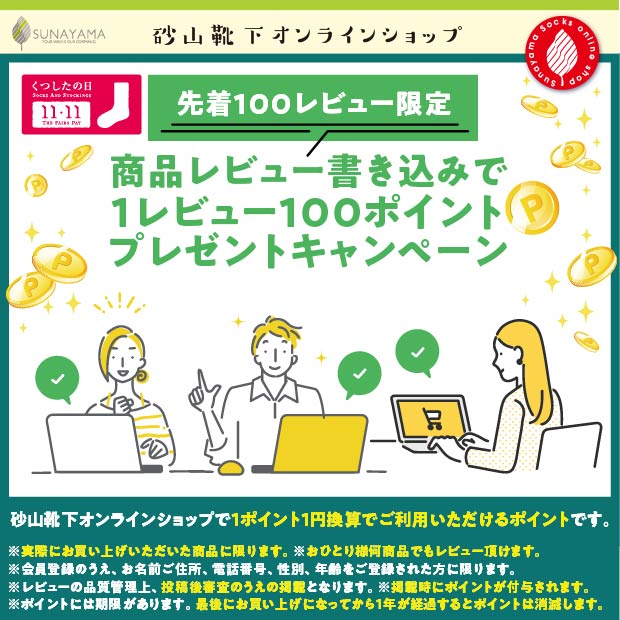 砂山靴下オンラインショップでは、商品レビュー書き込みで、1レビュー100ポイントプレゼントキャンペーンを行います。これまでお買い上げ頂いた商品のレビューを、おひとり様何商品でもレビュー頂けます。砂山靴下オンラインショップに会員登録のうえ、お名前、ご住所、電話番号、性別、生年月日をご登録されたお客様に限らせていただきます。