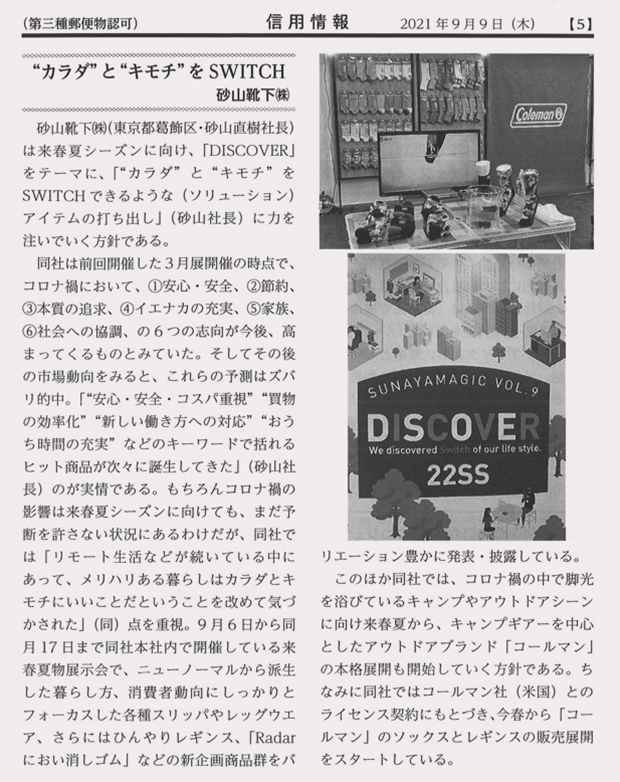 2021年09月09日 「信用情報2021年9月9日号」にて、弊社展示会「SUNAYAMAGIC Vol.9 DISCOVER」をご紹介いただきました。 株式会社信用交換所が発行する「信用情報2021年9月9日号」にて、弊社展示会「SUNAYAMAGIC Vol.9 DISCOVER」をご紹介いただきました。 < 前へ 一覧へ 次へ >