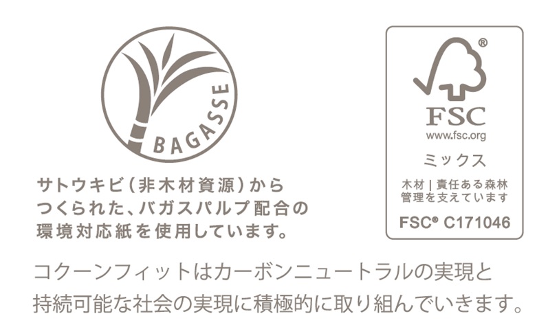 またコクーンフィットでは木材資源を貴重な資源と考え、低炭素・循環型社会実現のため、使用している中台紙などを非木材紙であるサトウキビの搾りカス(廃棄されるもの)を配合した紙に切り替えました。